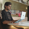 One foldable aluminium stand. Raises your laptop to eye level, holds your phone with MagSafe, and doubles as a tablet stand - all in 150g